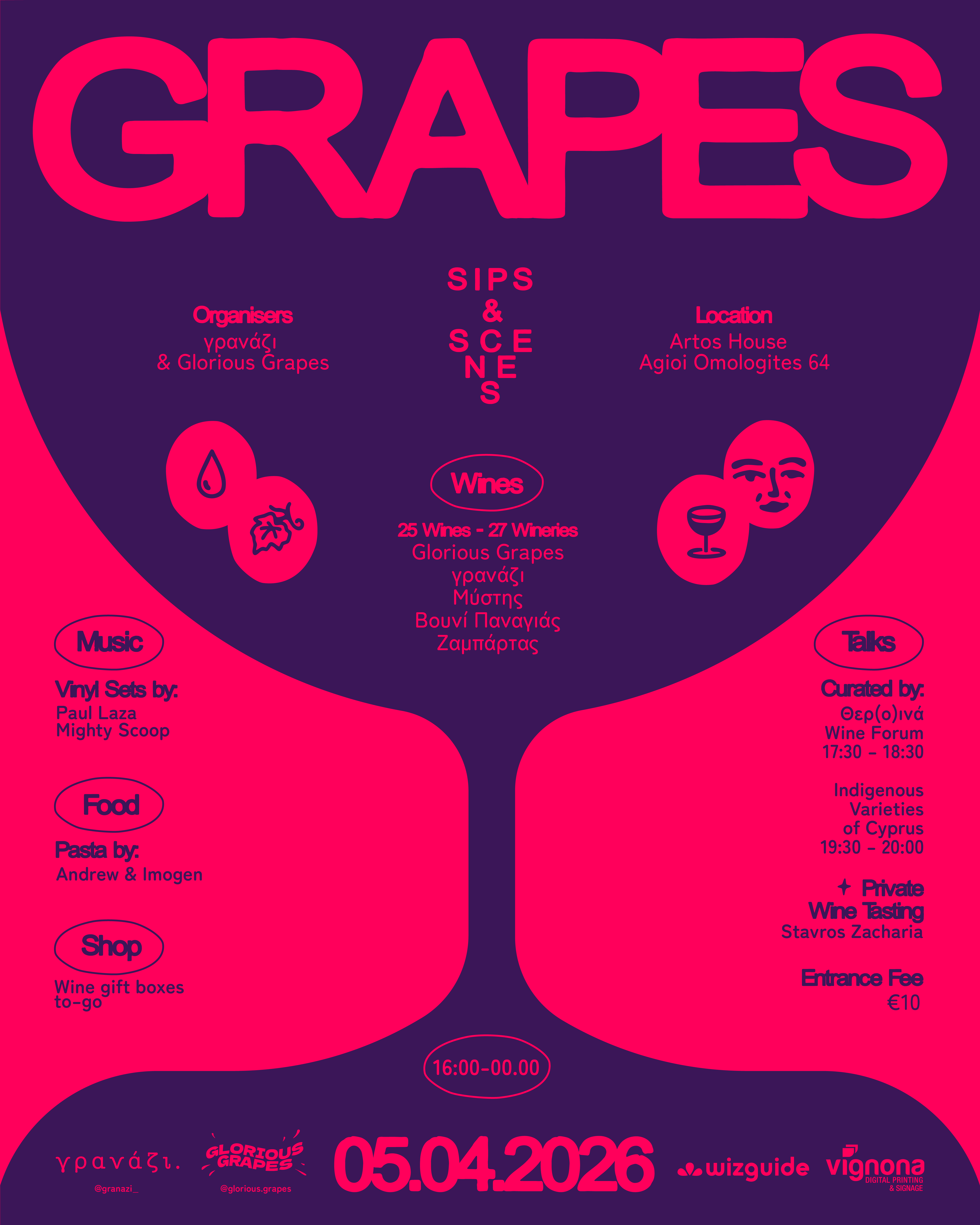 Το πρότζεκτ Glorious Grapes και το μπαρ Γρανάζι παρουσιάζουν μια επιμέλεια 34 ετικετών από 11 οινοποιεία από Ισπανία, Ελλάδα και Κύπρο. Όλα τα κρασιά θα σερβίρονται στο μπαρ σε δοκιμή, ποτήρι ή φιάλη με αντίστοιχη χρέωση, ενώ για αγορά και δώρα θα διατίθενται στο Grapes / Shop.